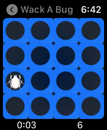 Whack as many bugs you can in 30 second. Top scores screen displays the top five scores and settings screen to enable/disable sound.